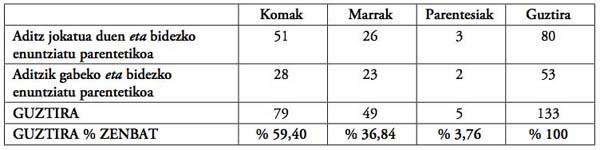 Taulari erreparatuz gero, ohartuko gara E1en eta E2ren arteko harremana inolako marka formalik gabe gauzatzen denean, Mitxelenak gehiago jotzen duela parentesi eta marra bikoitzetara eta gutxiagotan koma parea erabiltzera. Bereziki parentesietara jotzeko arrazoia izan daiteke E1 eta E2 enuntziatuen arteko haustura formala8 horietan handiagoa dela; hau da, bien arteko koherentziazko harremana inolako kohesio-baliabiderik gabe gauzatzen dela.