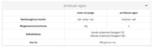 Bigarren irudian ikus daitekeenez, datu-basean juego izena duten bost konbinazio aurkitu dira: dar juego, hacer juego, desbancar en el juego, estar en juego eta poner en juego. Euskarazko ordainak sarreren eskuinaldean agertzen dira, eta horietako bakoitzak [+] ikur bat du aldamenean, informazio linguistikoa erakusteko edo ezkutatzeko. Arriskuan egon konbinazioaren gainean klikatuz gero, adibidez, hirugarren irudiko taula agertzen da.