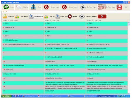 Testuak etiketatu ondoren, lerrokatu egin beharko ditugu, hirugarren funtzio nagusia erabiliz, Alinear. Bi, hiru edo testu gehiago lerrokatu daitezke aldi berean, aurretik sortu ditugun xml artxiboetatik abiatuz. Segundo gutxiren buruan lerrokatuko du programak testu bikote, hirukote, laukotea... (testuak oso luzeak baldin badira, denbora pixka bat har dezake kontuak). 7. irudian, behin testuak lerrokatuta programaren itxura ikus dezakegu.